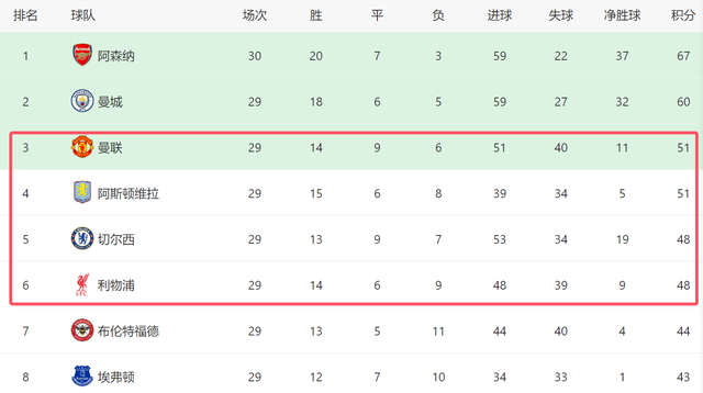 由于曼联输球,英超争四格局也更加混乱了。截至目前,曼联、维拉、切尔西和利物浦这4支争四球队,本轮的比赛都已经结束,由于切尔西在客场4-1大胜维拉,因此他们已经反超利物浦,排名回到第五位,而曼联虽然继续排名第三,但是他们只领先第六的利物浦3分,争四形势随时将发生逆转。